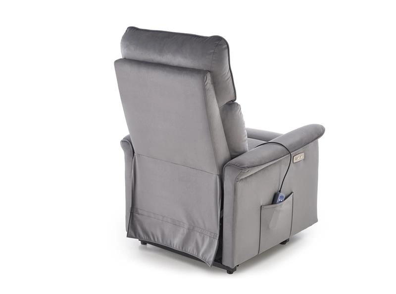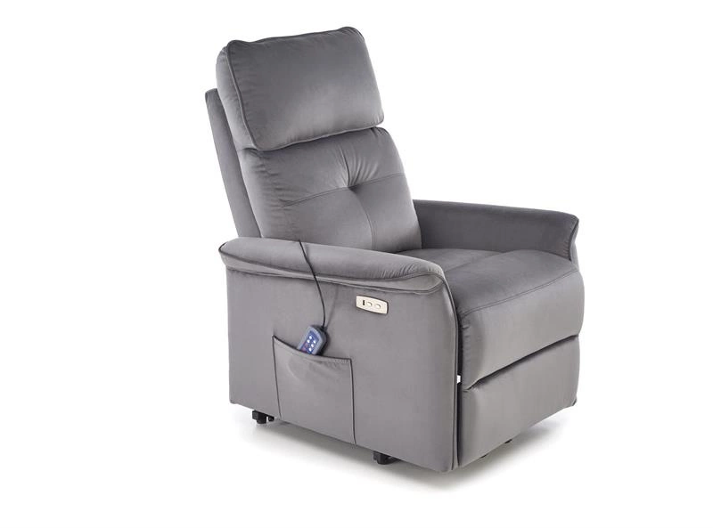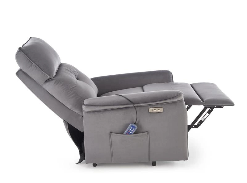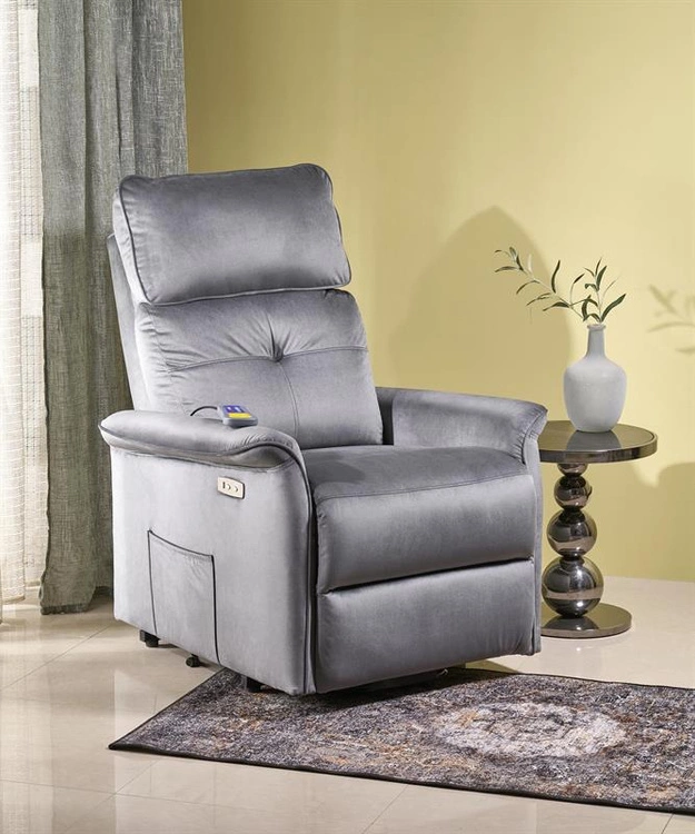 • Fotel wypoczynkowy SEMIR 2 w popielatej tkaninie BLUVEL 14 oferuje pełnię komfortu dzięki funkcjom: elektrycznego rozkładania, pionizacji, masażu oraz gniazdu USB. Idealny do relaksu i codziennego wypoczynku.