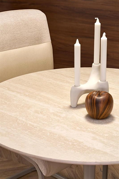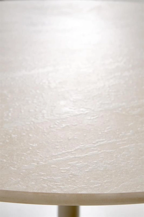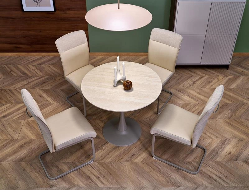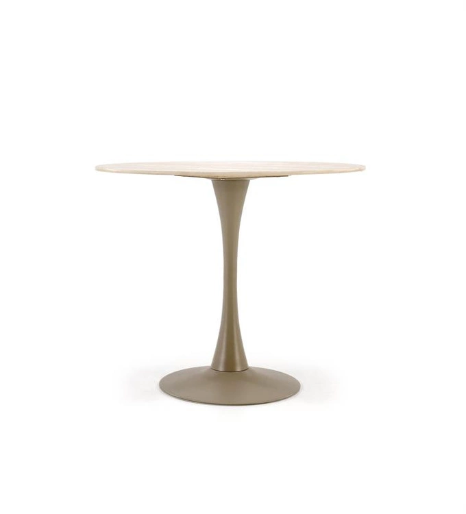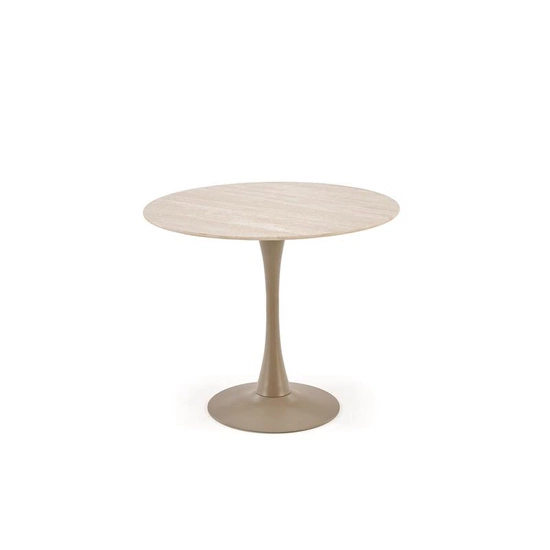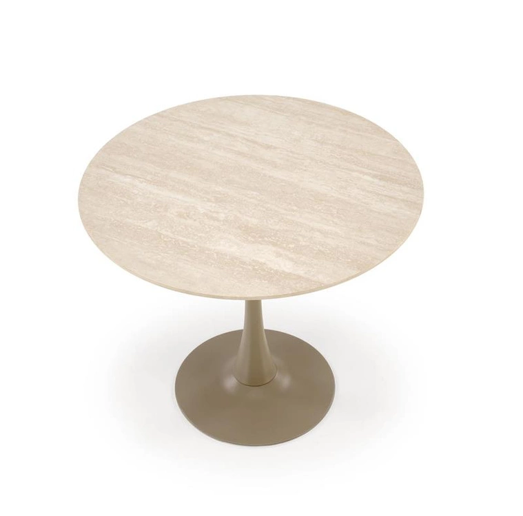 - Stół okrągły TOLIO o średnicy 90 cm zachwyca eleganckim blatem ze spieku w kolorze trawertynu oraz stabilną stalową podstawą w odcieniu kaszmiru. Idealny do nowoczesnych wnętrz, łączy funkcjonalność z wyrafinowanym stylem.