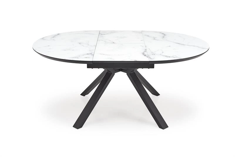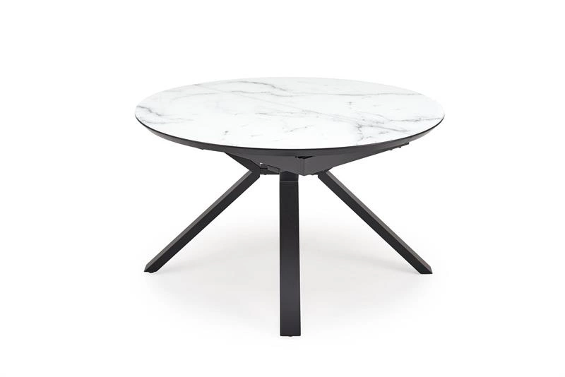 - Stół rozkładany VERTIGO z blatem w wykończeniu białego marmuru i czarnymi stalowymi nogami to połączenie elegancji i nowoczesności. Okrągły blat 130 cm można powiększyć do 180 cm, tworząc idealne miejsce na spotkania w większym gronie.