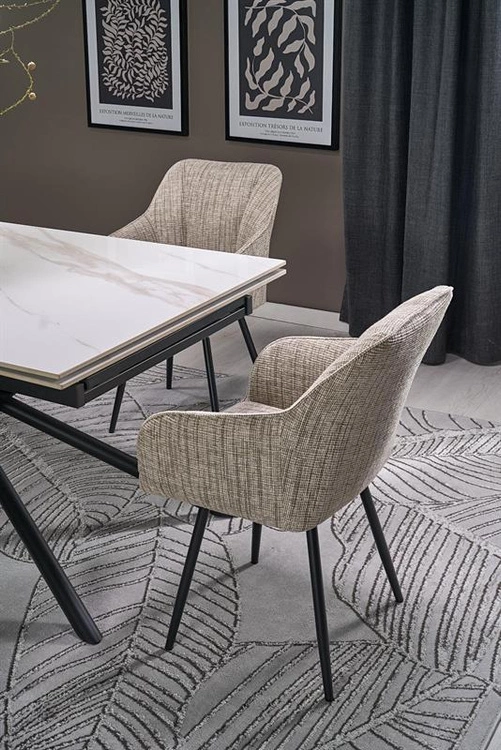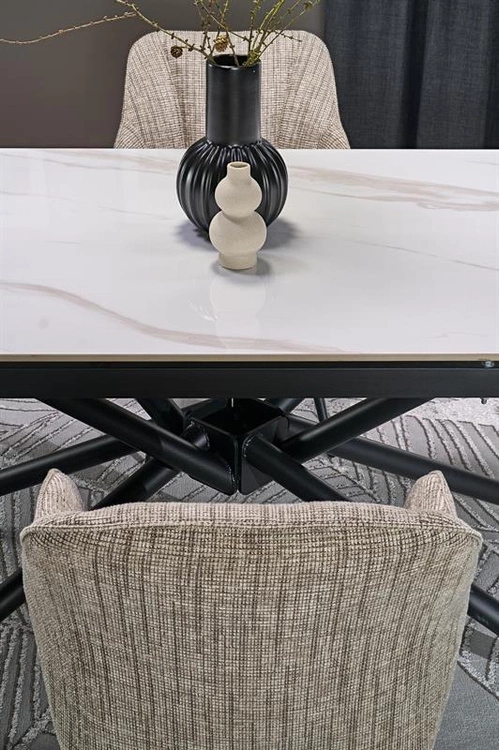 VITORINO to nowoczesny stół rozkładany, który łączy w sobie wyjątkowy design inspirowany elegancją marmuru z praktyczną funkcjonalnością. Blat wykonany z wysokiej jakości spieku w odcieniu białego marmuru jest odporny na zarysowania, wysoką temperaturę i wilgoć, co zapewnia mu trwałość na lata. Stabilne, czarne nogi ze stali malowanej proszkowo dodają mu nowoczesnego charakteru i gwarantują solidne podparcie. Dzięki systemowi rozkładania stół można łatwo powiększyć z 160 do 220 cm, co sprawia, że świetnie sprawdzi się zarówno na co dzień, jak i podczas większych spotkań rodzinnych czy przyjęć. To doskonały wybór do nowoczesnych jadalni i salonów, w których liczy się zarówno styl, jak i wygoda użytkowania.