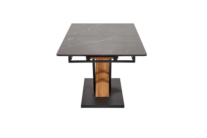 - Stół rozkładany VOLANT 160 zachwyca eleganckim blatem z efektem czarnego marmuru oraz nogami w odcieniu dębu złotego z czarnymi akcentami. Funkcja rozkładania zwiększa jego długość do 200 cm, idealny do nowoczesnej jadalni.