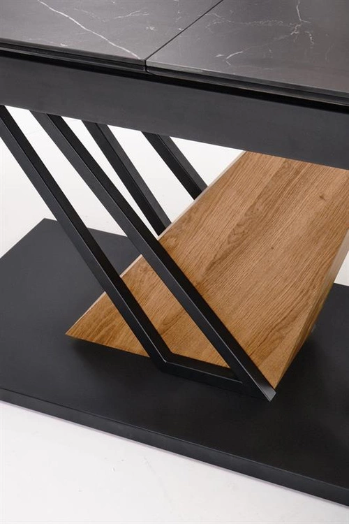 Stół rozkładany VOLANT 160 z czarnym marmurowym blatem oraz nogami w odcieniu dębu złotego z czarnymi akcentami