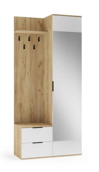 - Przedpokój CORAL w kolorze dąb złoty / biały to praktyczny zestaw z lustrem, szafką i wieszakami. Funkcjonalny układ i eleganczne połączenie barw nadają wnętrzu nowoczesny i przytulny charakter.
