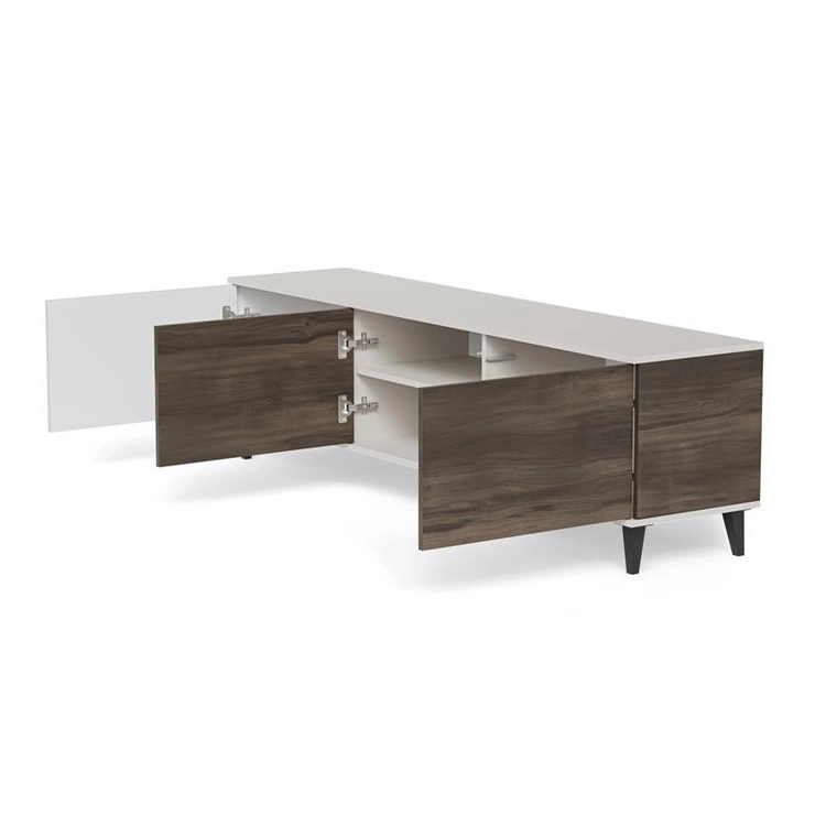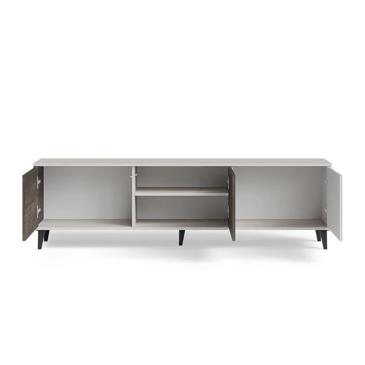 RANDOM 2 RTV-2 to większy wariant stolika telewizyjnego z kolekcji RANDOM 2, wyróżniający się nowoczesnym wzornictwem i harmonijnym połączeniem kolorów: kaszmiru, orzecha i czerni. Mebel został wykonany z wysokiej jakości płyty meblowej oraz MDF-u okleinowanego, co zapewnia trwałość i estetyczne wykończenie. Długość 180 cm pozwala na wygodne ustawienie telewizora oraz sprzętów multimedialnych, takich jak dekodery czy konsole. Funkcjonalne wnętrze skrywa zamykane szafki i otwarte wnęki, które umożliwiają uporządkowane przechowywanie kabli, akcesoriów i nośników. Całość uzupełniają stabilne nóżki z polipropylenu w czarnym kolorze, podkreślające nowoczesny styl mebla.