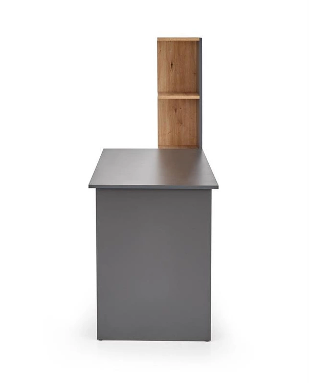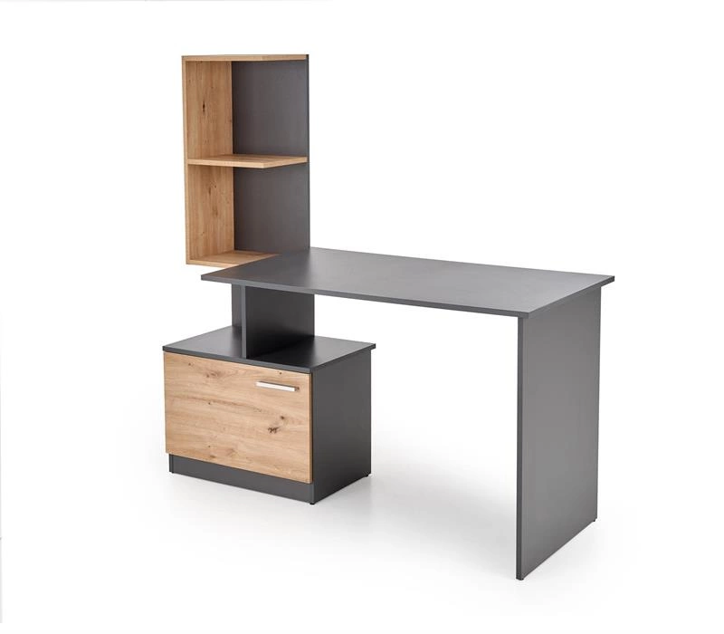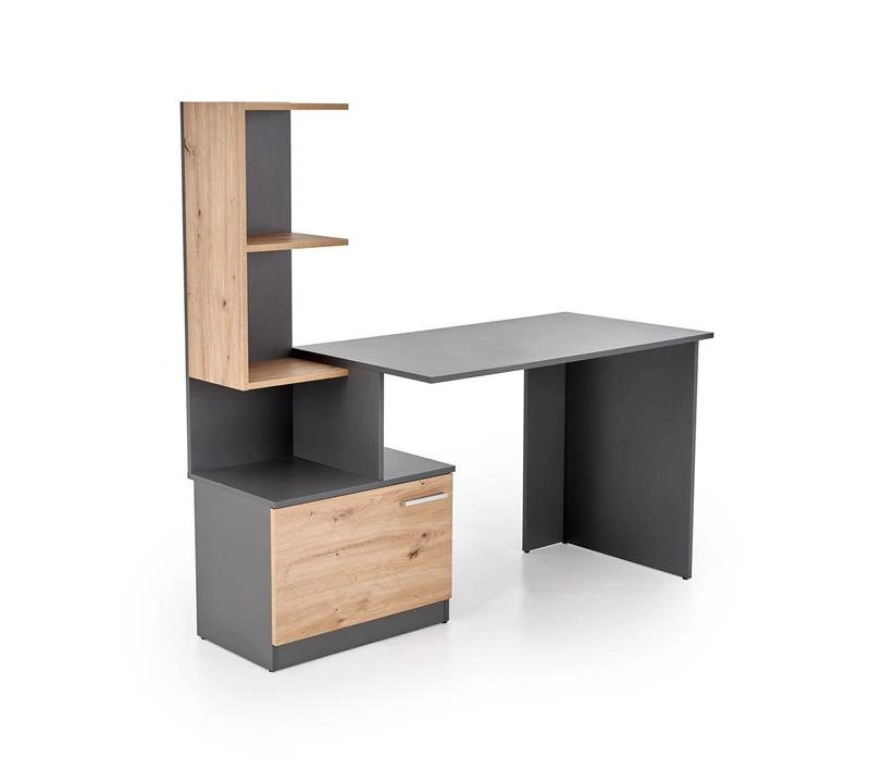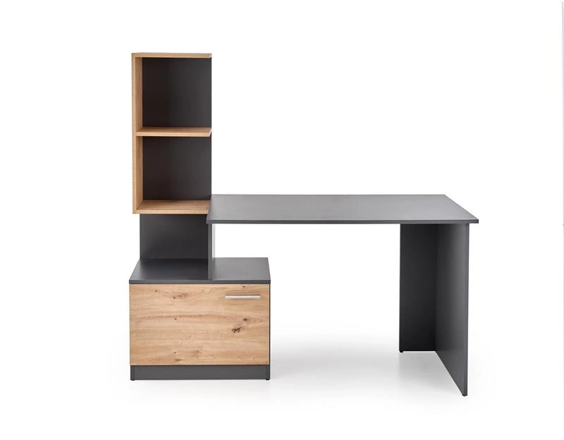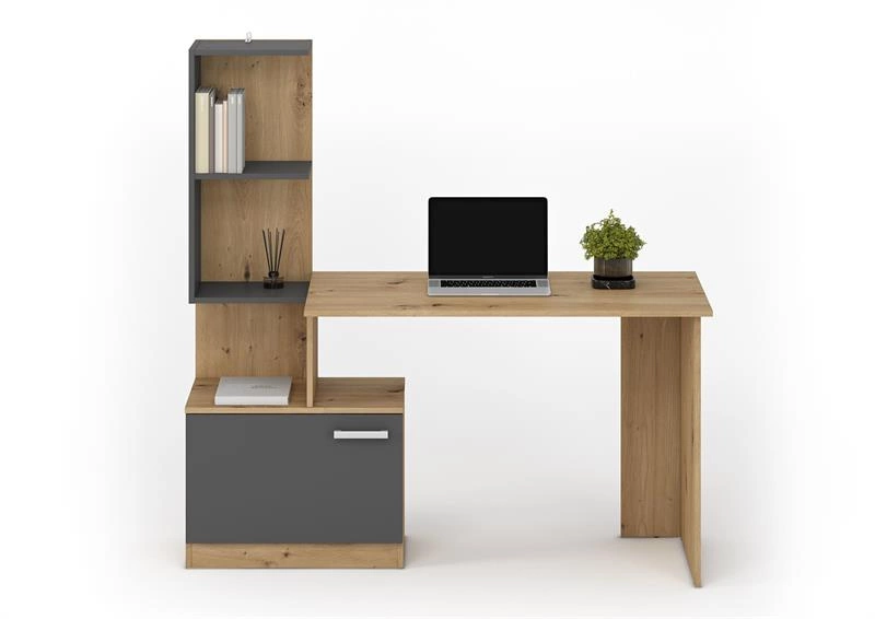 - Biurko MISO w kolorze grafitowym z akcentami dębu artisan wyróżnia się nowoczesnym designem i praktycznym układem półek. Szeroki blat i funkcjonalne rozmieszczenie przestrzeni czynią je idealnym miejscem do pracy lub nauki.