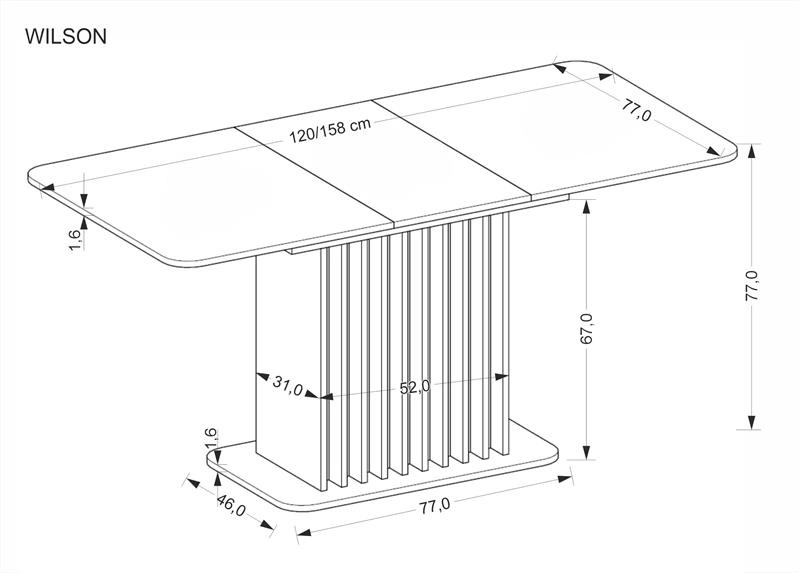 - Stół rozkładany WILSON w dekorze dąb artisan/czarny to praktyczne i stylowe rozwiązanie do jadalni. Kompaktowy na co dzień, z możliwością rozłożenia, wykonany z laminowanej płyty meblowej, trwały i łatwy w pielęgnacji.