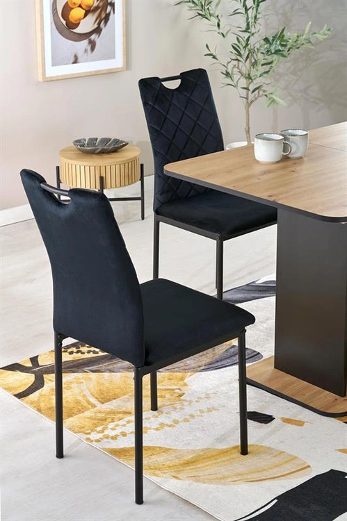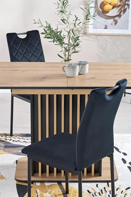 Stół WILSON w wykończeniu dąb artisan z czarnymi akcentami to funkcjonalna i estetyczna propozycja do nowoczesnych wnętrz. Dzięki prostemu systemowi rozkładania blat można powiększyć z 120 do 158 cm, co czyni go idealnym rozwiązaniem na rodzinne posiłki lub okazjonalne spotkania. Blat oraz nogi wykonane są z trwałej płyty meblowej laminowanej, odpornej na codzienne użytkowanie i łatwej w czyszczeniu. Ciepły odcień dębu artisan nadaje wnętrzu przytulności, a czarne wstawki dodają nowoczesnego charakteru. Stół WILSON doskonale sprawdzi się zarówno w jadalni, kuchni, jak i małym salonie, oferując styl i wygodę użytkowania.