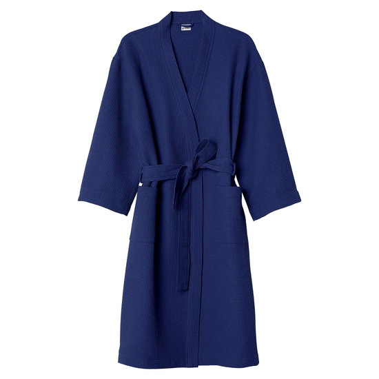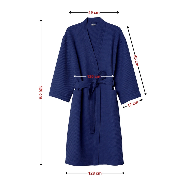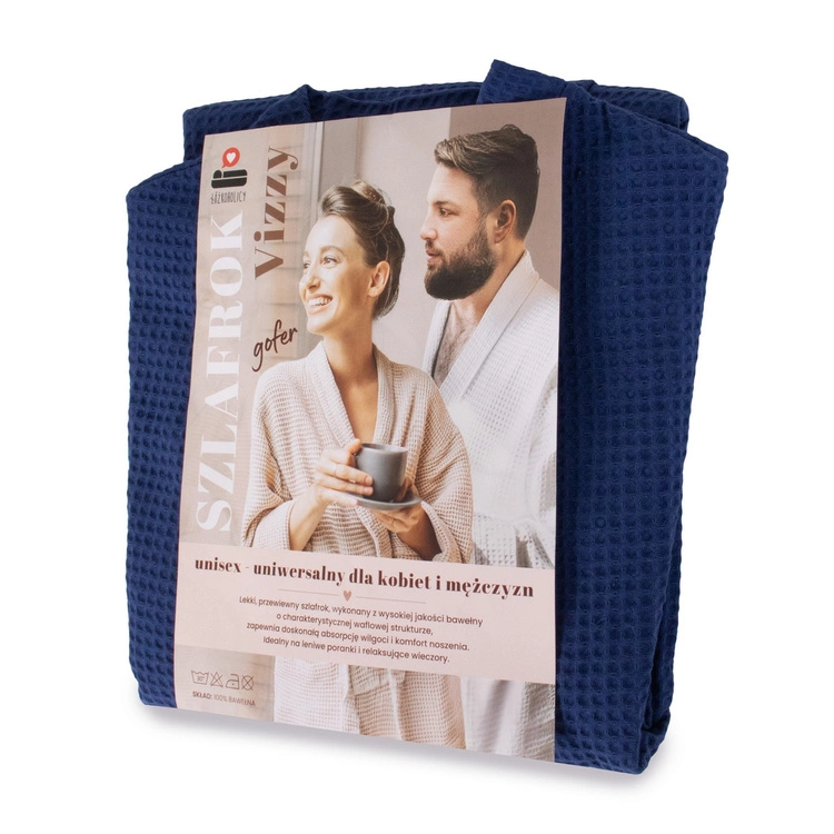 - Elegancki szlafrok unisex w kolorze granatowym, uszyty w 100% z oddychającej bawełny o strukturze gofra. Lekki, przewiewny i komfortowy – idealny na leniwe poranki, wieczory po kąpieli i chwile relaksu. Wyposażony w wiązanie i praktyczne kieszenie.