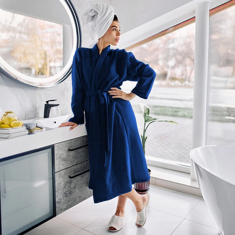 - Elegancki szlafrok unisex w kolorze granatowym, uszyty w 100% z oddychającej bawełny o strukturze gofra. Lekki, przewiewny i komfortowy – idealny na leniwe poranki, wieczory po kąpieli i chwile relaksu. Wyposażony w wiązanie i praktyczne kieszenie.