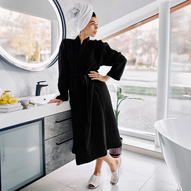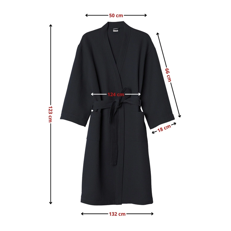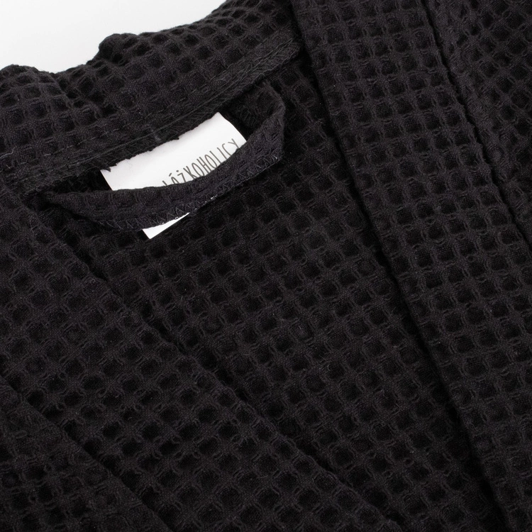 • Elegancki i ponadczasowy szlafrok unisex w kolorze czarnym, wykonany ze 100% bawełny o strukturze waflowej (gofer). Lekki, przewiewny i przyjemny w dotyku – idealny na każdą porę roku. Z wiązaniem w talii i praktycznymi kieszeniami.