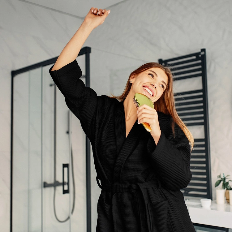 Bawełna o strukturze waflowej ma doskonałe właściwości użytkowe – dobrze chłonie wilgoć, szybko wysycha i pozwala skórze oddychać. W dotyku jest przyjemna i lekko masująca, co zwiększa komfort noszenia. To idealna alternatywa dla klasycznego, cięższego frotte.