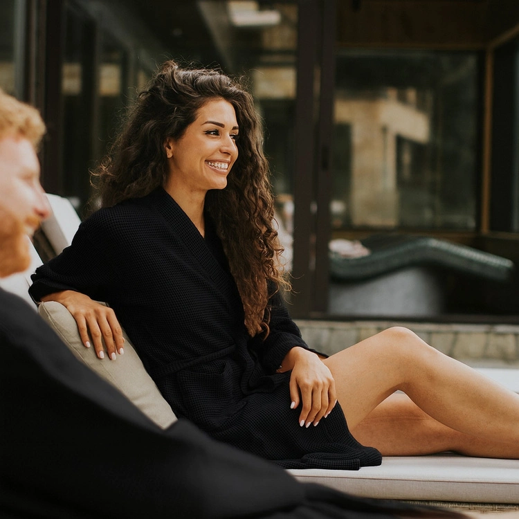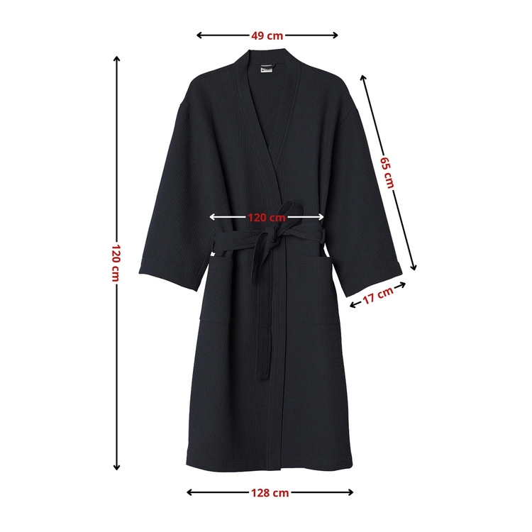 • Elegancki i ponadczasowy szlafrok unisex w kolorze czarnym, wykonany ze 100% bawełny o strukturze waflowej (gofer). Lekki, przewiewny i przyjemny w dotyku – idealny na każdą porę roku. Z wiązaniem w talii i praktycznymi kieszeniami.