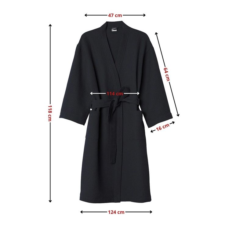 • Lekki i oddychający szlafrok unisex w klasycznym czarnym kolorze, wykonany ze 100% bawełny o strukturze waflowej (gofer). Idealny po kąpieli, na poranki i wieczory, sprawdzi się zarówno w domu, hotelu, jak i podczas podróży.