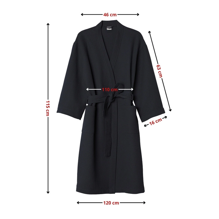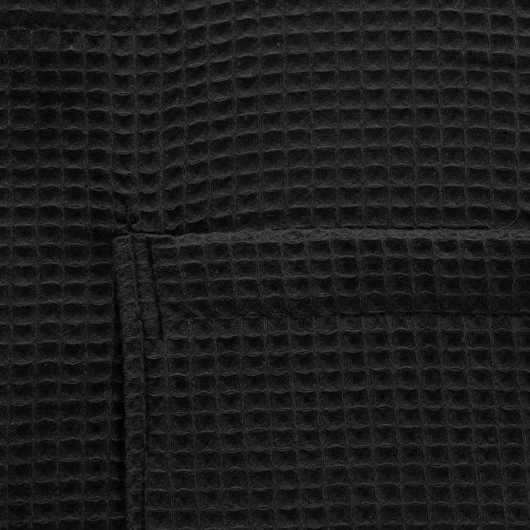 - Lekki i oddychający szlafrok unisex w klasycznym czarnym kolorze, wykonany ze 100% bawełny o strukturze waflowej (gofer). Idealny po kąpieli, na poranki i wieczory, sprawdzi się zarówno w domu, hotelu, jak i podczas podróży.