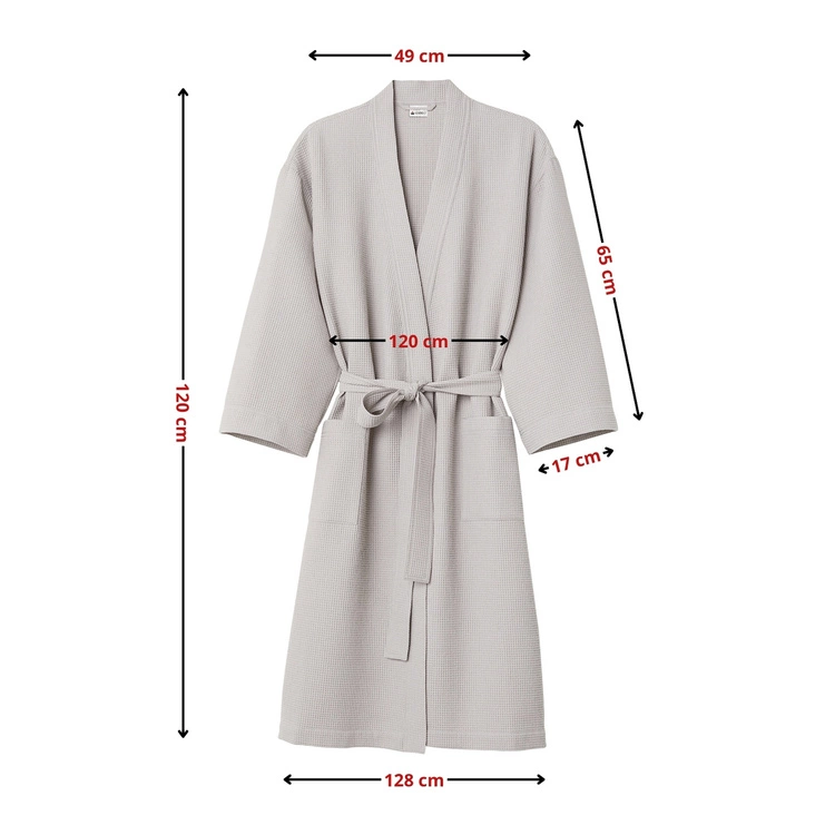 - Stylowy i praktyczny szlafrok unisex w eleganckim szarym odcieniu, wykonany ze 100% bawełny o strukturze waflowej (gofer). Lekki, oddychający i komfortowy – idealny po kąpieli, w domowym zaciszu czy na wyjazdy.