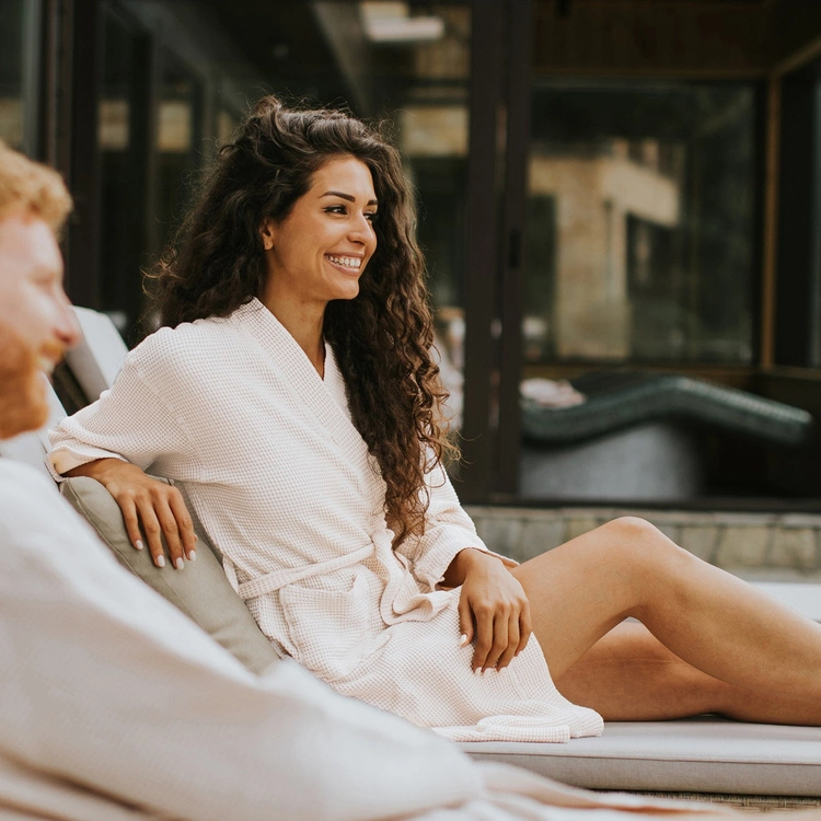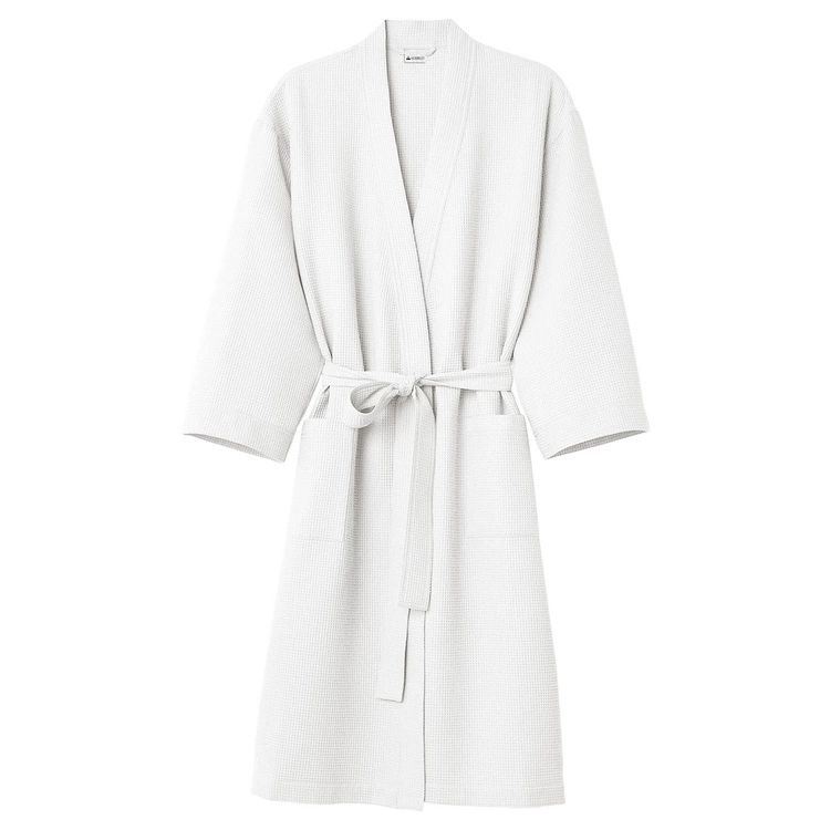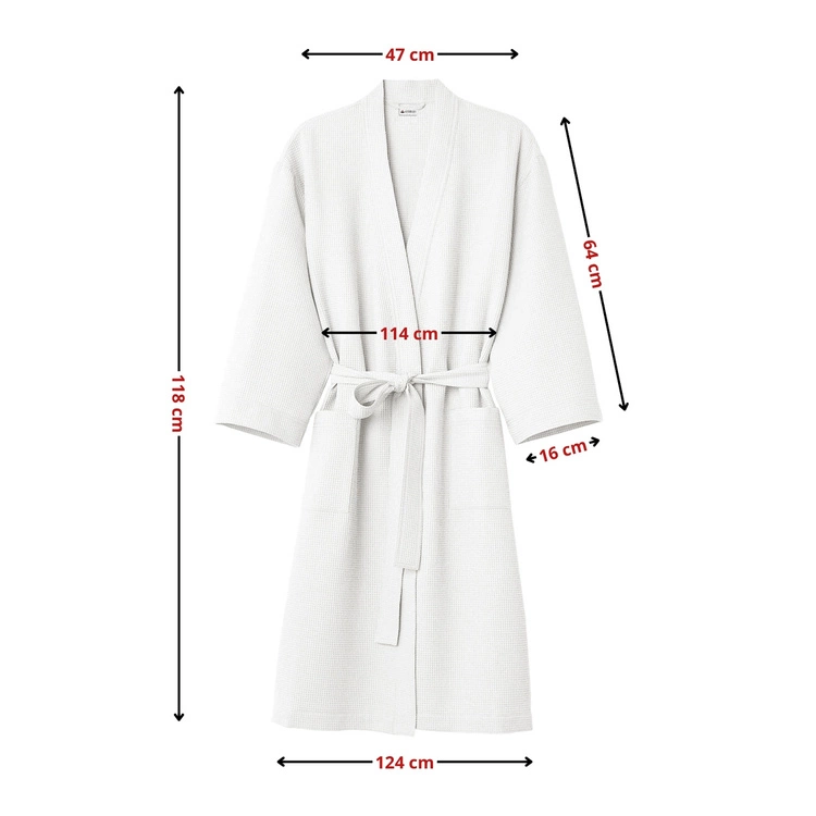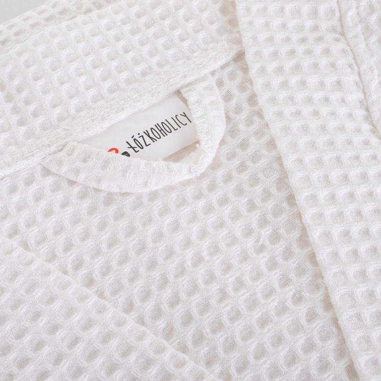 - Klasyczny biały szlafrok unisex wykonany w 100% z oddychającej bawełny o strukturze waflowej (gofer). Lekki, wygodny i ponadczasowy – idealny do domu, hotelu czy spa.