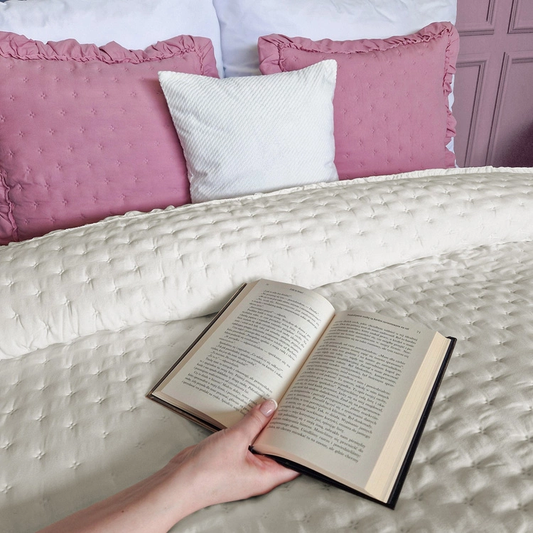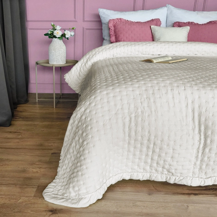 Dekoracyjna falbana dodaje narzucie romantycznego, kobiecego charakteru, a precyzyjne pikowanie podkreśla jej elegancki wygląd. Dzięki temu łóżko zawsze prezentuje się estetycznie – nawet jeśli nie zostało idealnie pościelone. Narzuta skutecznie chroni pościel przed kurzem i zabrudzeniami, co czyni ją nie tylko ozdobą, ale również praktycznym elementem wyposażenia.