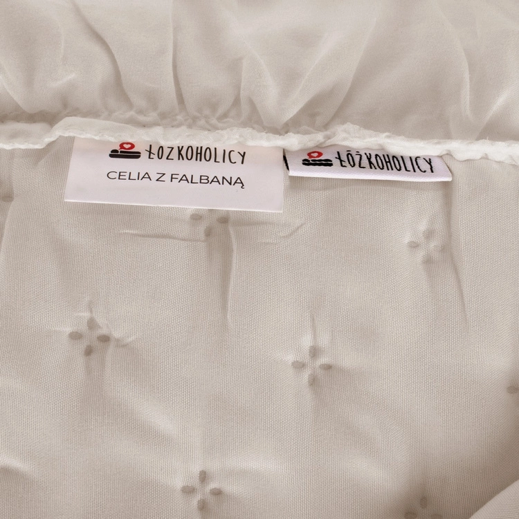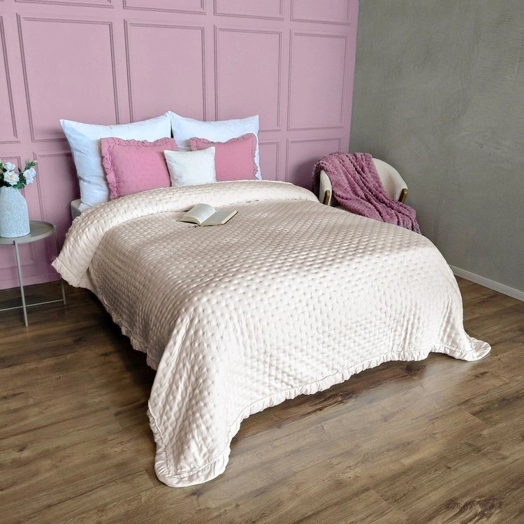 Dekoracyjna falbana delikatnie otacza narzutę, dodając jej lekkości i romantycznego charakteru, dzięki czemu łóżko zawsze wygląda elegancko i schludnie. Subtelne, regularne pikowanie podkreśla walory estetyczne oraz zapobiega przesuwaniu się wypełnienia, gwarantując nienaganny wygląd każdego dnia.