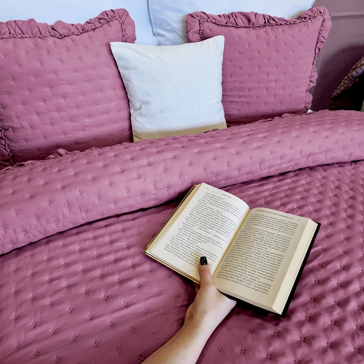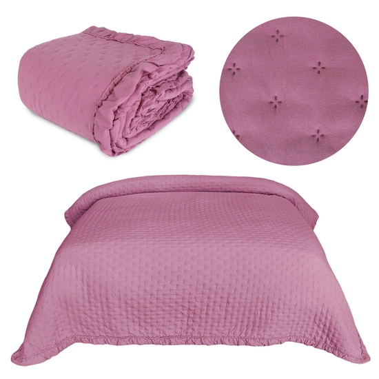 Rozmiar 200x220 cm czyni ją doskonałą propozycją na łóżka dwuosobowe, gdzie może pełnić rolę zarówno praktycznej ochrony pościeli, jak i efektownej dekoracji. Różowy odcień tkaniny wprowadza do aranżacji świeżość, romantyzm i przyjemne poczucie ciepła, tworząc wyjątkową atmosferę w sypialni.