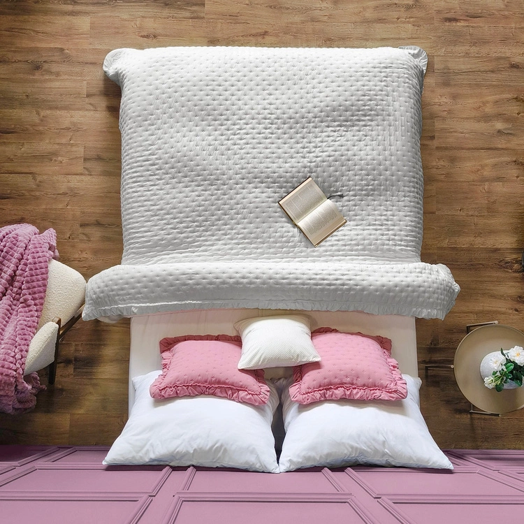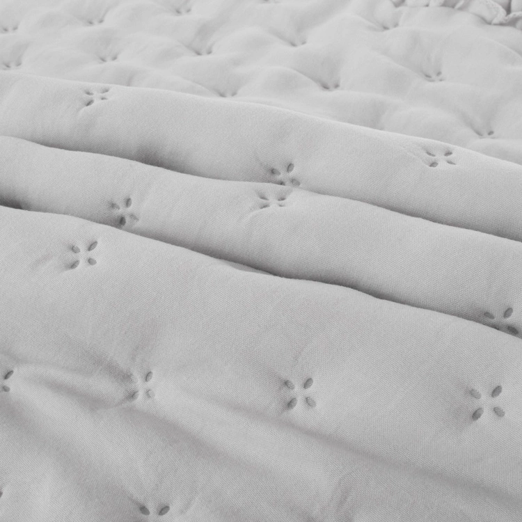 Zewnętrzna falbana nadaje narzucie romantycznego charakteru, wprowadzając do wnętrza nutę lekkości i przytulności. Z kolei subtelne, regularne pikowanie podkreśla elegancję tkaniny, a jednocześnie utrzymuje wypełnienie na miejscu, zapewniając narzucie trwały i estetyczny wygląd przez długi czas.