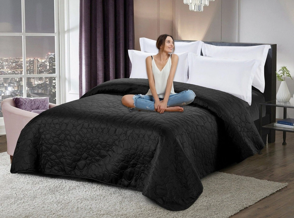 - Narzuta Nicole 170x210 w odcieniach czerni to elegancka propozycja dla osób, które cenią wyraziste dodatki i ponadczasowy styl. Wykonana z miękkiej i trwałej mikrofibry, nie tylko zdobi wnętrze, ale także zapewnia ochronę pościeli i wprowadza do sypialni
