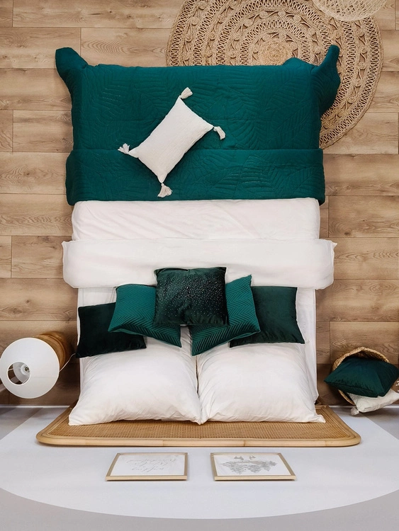 Duży rozmiar 220x240 cm sprawia, że Nicole 08 doskonale prezentuje się na szerokich łóżkach małżeńskich, otulając je i nadając im luksusowego wyglądu. Zieleń, jako barwa inspirowana naturą, tworzy wyjątkowy klimat – w minimalistycznych aranżacjach dodaje życia i świeżości, a w klasycznych wnętrzach ociepla i podkreśla ich elegancję.