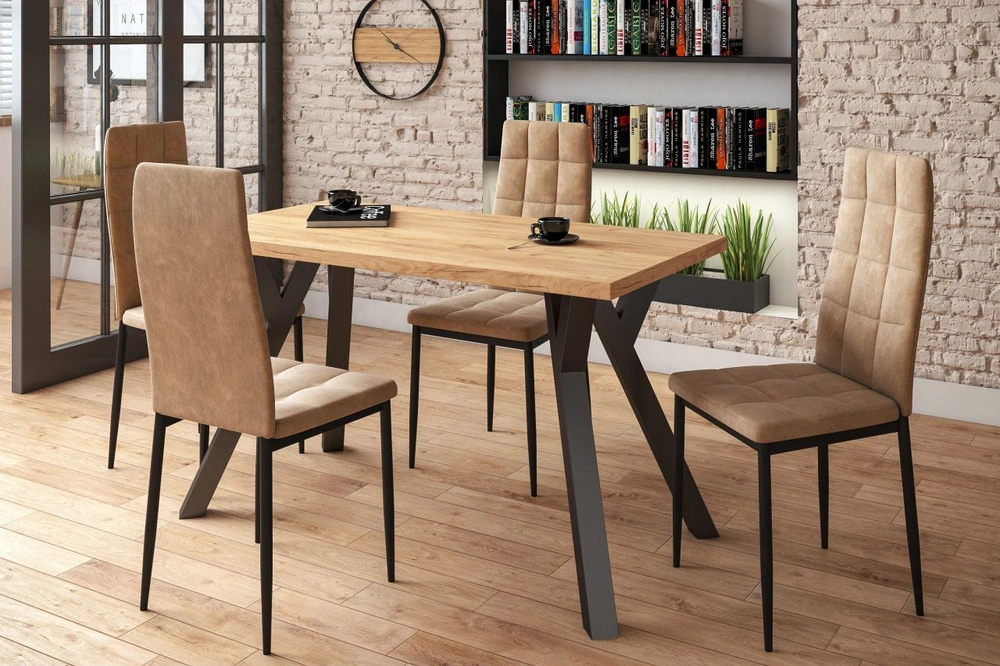 Stół VESTA to wyjątkowe połączenie elegancji i funkcjonalności, które doskonale odnajdzie się w nowoczesnych wnętrzach. Blat w dekorze dąb złoty craft ociepla przestrzeń, nadając jej naturalnego charakteru, a czarne stalowe nogi w formie litery Y dodają całości dynamicznego i designerskiego wyglądu. Laminowana powierzchnia blatu jest odporna na codzienne użytkowanie, a wykończenie obrzeżami ABS zwiększa trwałość i estetykę mebla. Stabilna konstrukcja z malowanej proszkowo stali zapewnia niezawodne użytkowanie przez lata. Dzięki kompaktowym wymiarom VESTA doskonale sprawdzi się w kuchni, jadalni czy salonie, tworząc stylowe i praktyczne miejsce do wspólnych posiłków.