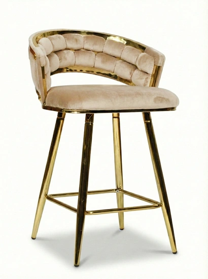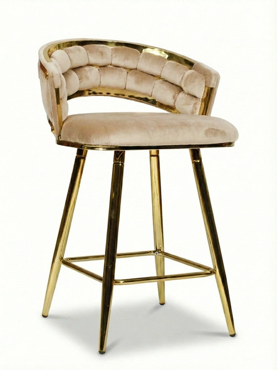 - Krzesło barowe TESSA VELVET w ciemnym beżu na złotym stelażu to elegancki półhoker o plecionym siedzisku. Miękki welur i luksusowe wykończenie wprowadzają do wnętrza styl glamour, zapewniając jednocześnie komfort i trwałość.