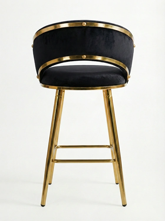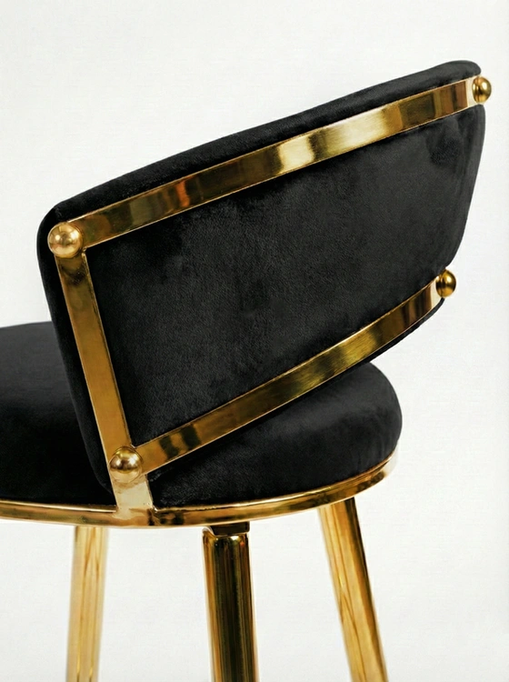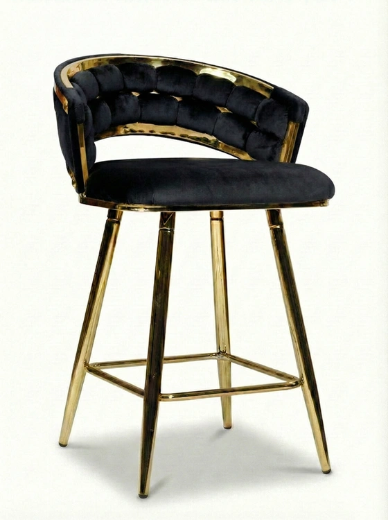 • Krzesło barowe TESSA VELVET w czarnym welurze na złotym stelażu to elegancki półhoker w stylu glamour. Plecione siedzisko z miękkiej tkaniny i stabilna metalowa konstrukcja łączą wygodę z luksusowym wyglądem, idealnym do wysp kuchennych i barów.