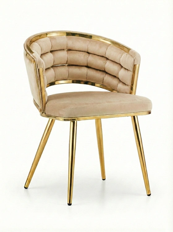 - Krzesło TESSA VELVET w ciemnym beżu na złotym stelażu zachwyca welurową tapicerką i przeplatanym oparciem. Elegancki design w stylu glamour łączy wygodę i trwałość, sprawiając, że doskonale dopełni jadalnię, salon czy przestrzeń komercyjną.