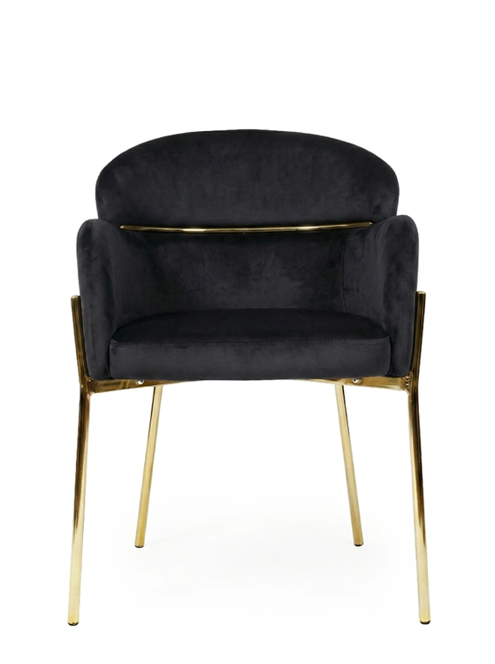 - Krzesło LUNGO VELVET w czarnej tapicerce na złotym stelażu to elegancki model glamour z wygodnymi podłokietnikami. Miękki welur i ozdobny złoty łącznik nadają mu luksusowego wyglądu, idealnego do jadalni, salonu czy restauracji.