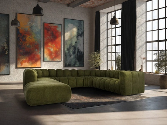 Sofa zachwyca futurystyczną linią — obłe kształty i głębokie przeszycia nadają jej elegancki, falisty wygląd, który przyciąga wzrok i dodaje wnętrzu charakteru. Modułowa konstrukcja pozwala dopasować układ do potrzeb – możesz zestawiać elementy według własnego pomysłu, tworząc układ idealnie pasujący do Twojej przestrzeni.