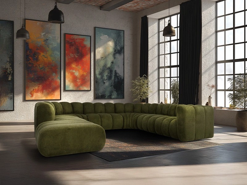 Miękkie siedziska, profilowane oparcia i przyjemna w dotyku tapicerka zapewniają komfort codziennego użytkowania. Sofa świetnie sprawdzi się zarówno w dużych salonach i apartamentach typu open space, jak i w nowoczesnych przestrzeniach komercyjnych, tworząc przytulną strefę relaksu.