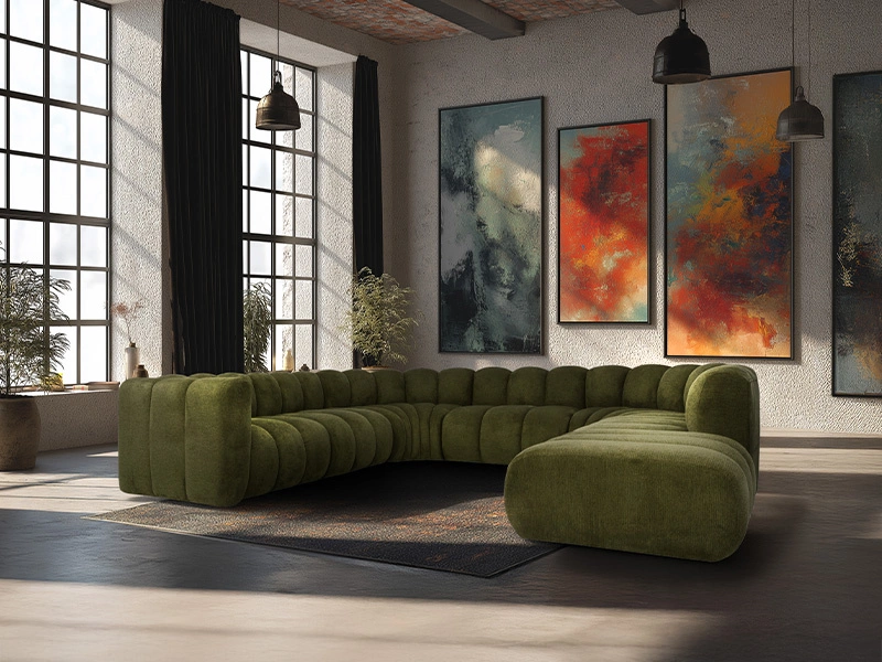 Zaokrąglone linie, głębokie przeszycia i falista forma nadają sofie futurystyczny, elegancki wygląd, który przyciąga wzrok i czyni ją centralnym punktem aranżacji wnętrza. Modułowa konstrukcja pozwala łatwo dostosować układ do przestrzeni – możesz rozbudowywać, przestawiać elementy i tworzyć unikalne konfiguracje dopasowane do własnych potrzeb.