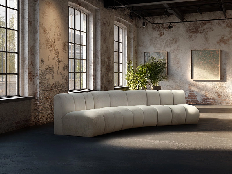 Modułowa konstrukcja umożliwia dopasowanie rozmiaru i kształtu sofy do indywidualnych potrzeb przestrzennych – świetnie sprawdzi się zarówno w przestronnych salonach, jak i bardziej kameralnych aranżacjach. Zaokrąglone kształty i głębokie przeszycia nadają sofie nowoczesny wygląd, a jednocześnie wprowadzają do wnętrza miękkość i przytulność.