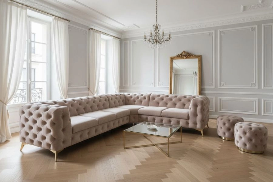 • Pikowana tapicerka z guzikami lub kryształkami (złote, srebrne, czarne, kolorowe)