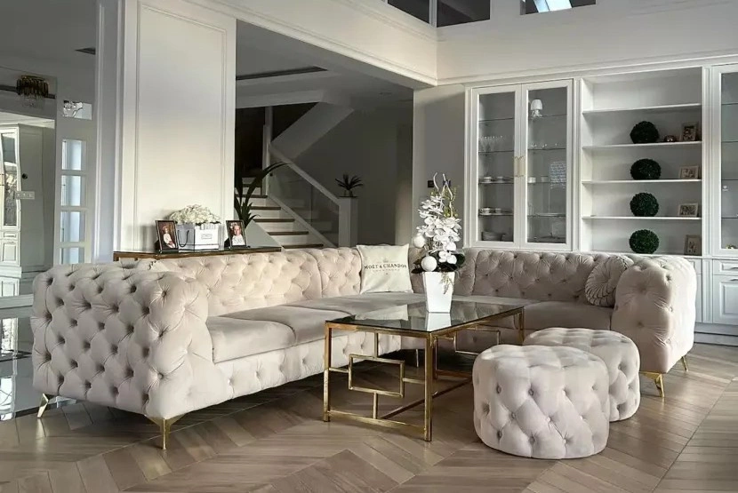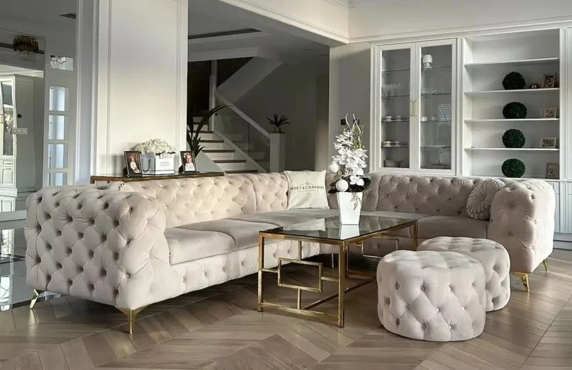- Elegancki narożnik MOMOA 202 × 202 cm w stylu glamour zachwyca nowoczesnym designem, pikowaną tapicerką oraz wygodnym siedziskiem. Idealny do stylowych salonów, w których liczy się zarówno komfort, jak i estetyka.