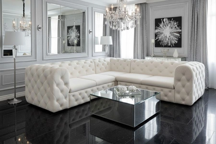 Ten efektowny narożnik MOMOA to idealne połączenie stylu glamour i codziennej funkcjonalności. Jego charakterystyczne ręczne pikowania, zdobione guzikami lub kryształkami w czterech wariantach kolorystycznych (złote, srebrne, czarne, kolorowe), tworzą niepowtarzalny efekt wizualny, który podkreśla elegancki charakter wnętrza. Narożnik doskonale sprawdzi się zarówno w klasycznych aranżacjach, jak i w nowoczesnych salonach, stając się centralnym punktem przestrzeni.