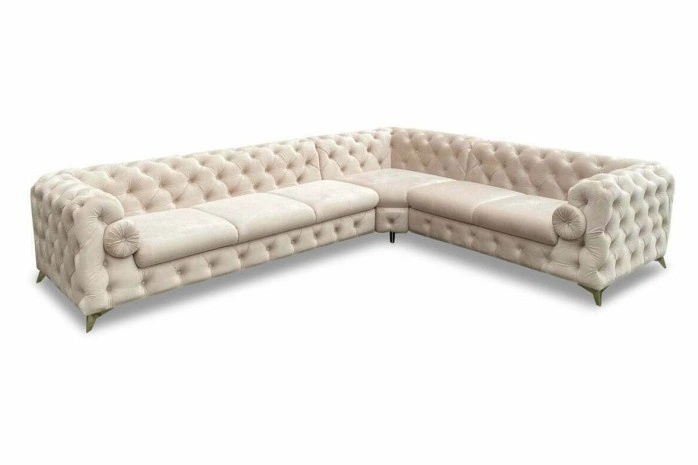 Narożnik MOMOA z wałkiem bez funkcji spania 262 × 202 cm to propozycja dla osób ceniących elegancki design i komfort użytkowania. Charakterystyczna, pikowana tapicerka zdobiona guzikami lub kryształkami (do wyboru: przezroczyste, złote, czarne lub kolorowe) podkreśla luksusowy styl glamour, wprowadzając do wnętrza wyjątkowy klimat. Subtelny połysk tkaniny w połączeniu z dopracowanymi detalami czyni z narożnika nie tylko funkcjonalny mebel, ale również efektowną ozdobę przestrzeni.