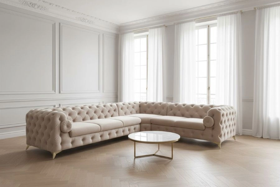 Narożnik MOMOA z wałkiem bez funkcji spania w wymiarze 202 × 202 cm to elegancki i komfortowy mebel, który idealnie sprawdzi się w mniejszych wnętrzach, nie tracąc przy tym swojego luksusowego charakteru. Jego charakterystyczne pikowane oparcia i boczki, zdobione guzikami lub kryształkami (w kolorach: przezroczyste, złote, czarne, kolorowe), wprowadzają do pomieszczenia nutę glamour i ekskluzywności. Dekoracyjny wałek umieszczony na oparciu dodaje całości szyku i unikalnego charakteru.