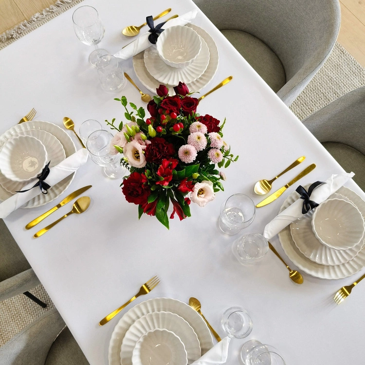 Biały obrus Hanah to idealny wybór na święta, rodzinne uroczystości czy romantyczne kolacje – jego ponadczasowa elegancja podkreśla wyjątkowy charakter każdej chwili. Specjalne wykończenie materiału zapobiega wsiąkaniu płynów, dzięki czemu obrus pozostaje czysty i estetyczny nawet przy częstym użytkowaniu. Delikatna mereżka biegnąca wokół obrusu dodaje mu subtelnego uroku i świadczy o wysokiej jakości wykonania.