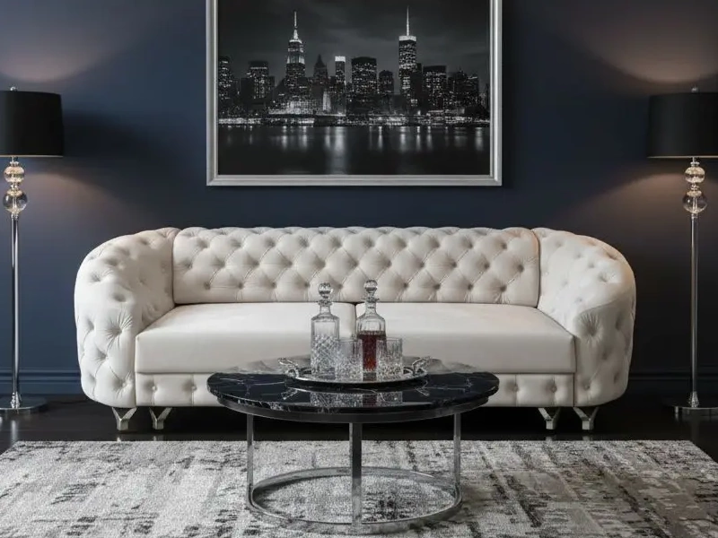 Eleganckie pikowania stanowią nie tylko ozdobę, ale i element wyróżniający kanapę LUCILLE. Guziki tapicerowane można zamienić na błyszczące kryształki w kolorze złotym, przezroczystym, czarnym lub kolorowym, co pozwala spersonalizować wygląd mebla i dodać mu wyjątkowego charakteru. Bogata oferta tkanin obiciowych w różnorodnych kolorach i fakturach umożliwia idealne dopasowanie kanapy do każdego stylu wnętrza — od klasycznego glamour po nowoczesne aranżacje.