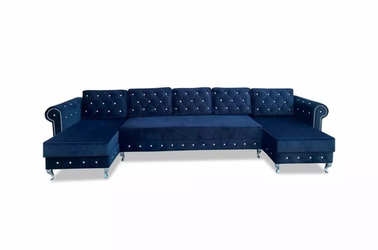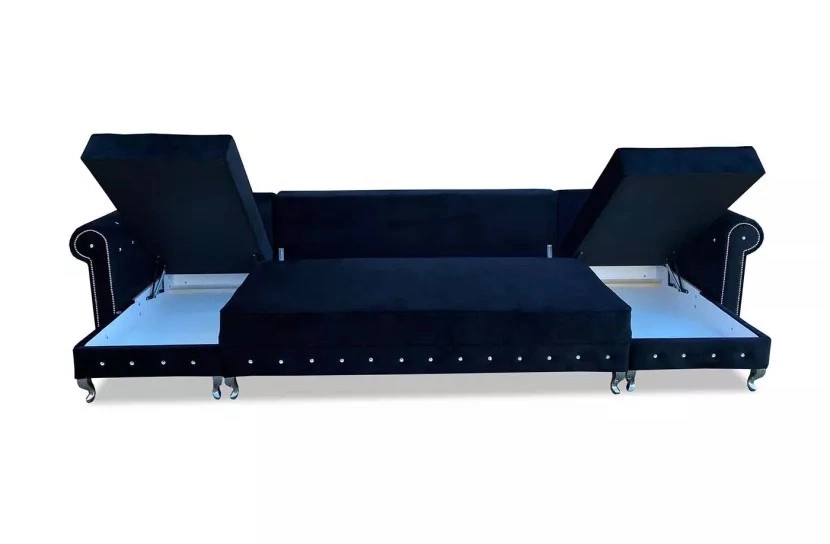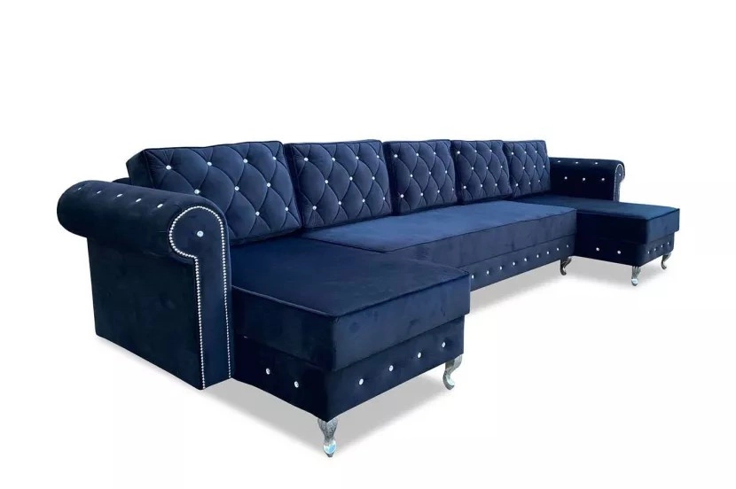 • Narożnik NANCY U duży to elegancki i przestronny mebel w stylu glamour, który łączy nowoczesny design z wyjątkową funkcjonalnością. Posiada funkcję spania, aż trzy pojemniki na pościel i pikowane wykończenie, tworząc idealne miejsce relaksu dla całej rodz