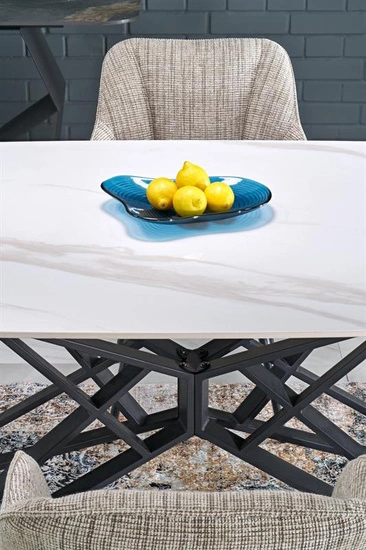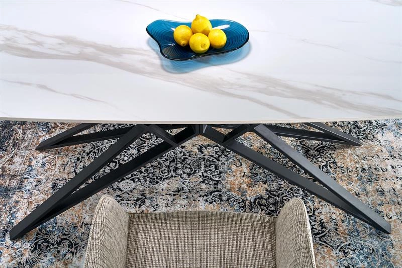 Centralnym elementem zestawu jest stół rozkładany ALFREDO, którego biały marmurowy blat wykonano z wysokiej jakości spieku. Materiał ten wyróżnia się wyjątkową odpornością na zarysowania, wilgoć i wysoką temperaturę, co gwarantuje nie tylko estetykę, ale i trwałość przez lata. Solidny czarny stelaż ze stali malowanej proszkowo dodaje stołowi stabilności i nowoczesnego charakteru, tworząc elegancki kontrast z jasnym blatem.