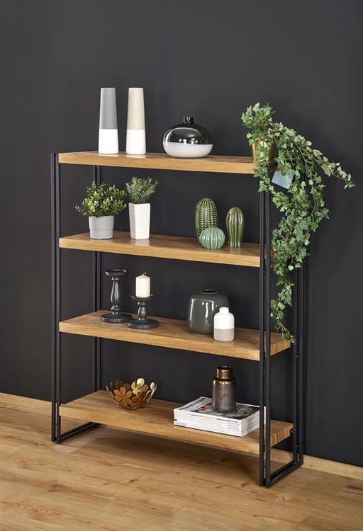 Blaty z płyty MDF w okleinie imitującej dąb złoty zachwycają ciepłą barwą i wyraźnym rysunkiem słojów, podczas gdy czarna stalowa rama malowana proszkowo gwarantuje stabilność i trwałość konstrukcji. Otwarty układ półek sprawia, że regał idealnie nadaje się do eksponowania książek, dekoracji lub roślin.