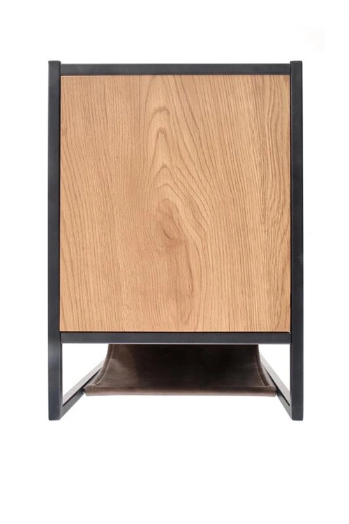 Blat wykonany z trwałego MDF-u w ciepłym odcieniu dębu złotego nadaje meblowi naturalny wygląd, a kontrastująca czarna podstawa ze stali malowanej proszkowo podkreśla jego loftowy charakter. Dodatkowym atutem jest stylowy element z eco skóry, który dodaje całości elegancji i nowoczesnego sznytu.