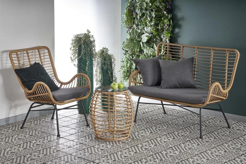 - Sofa IKARO XL to połączenie naturalnego rattanu syntetycznego z miękką, popielatą tkaniną. Osadzona na czarnej stalowej podstawie, zachwyca stylem i wygodą. Idealna do salonu, ogrodu zimowego lub wnętrz w stylu boho i skandynawskim.