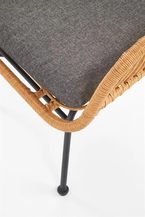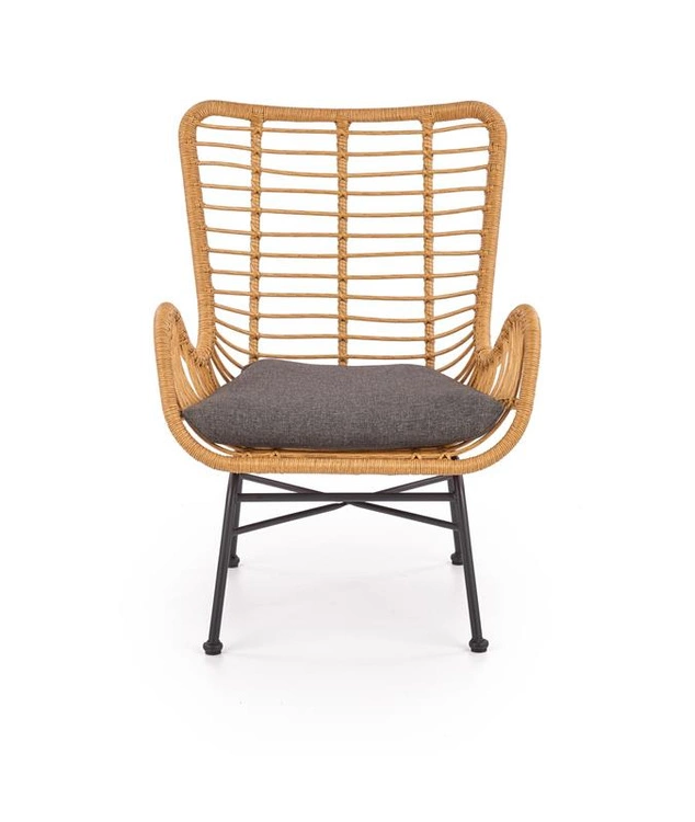 Fotel wypoczynkowy IKARO to stylowy mebel, który doskonale łączy naturalne materiały z nowoczesną formą. Oparcie i siedzisko z rattanu syntetycznego w kolorze naturalnym nadają wnętrzu ciepła i przytulności, a miękka, popielata poduszka tapicerowana tkaniną zapewnia wygodę podczas codziennego wypoczynku.