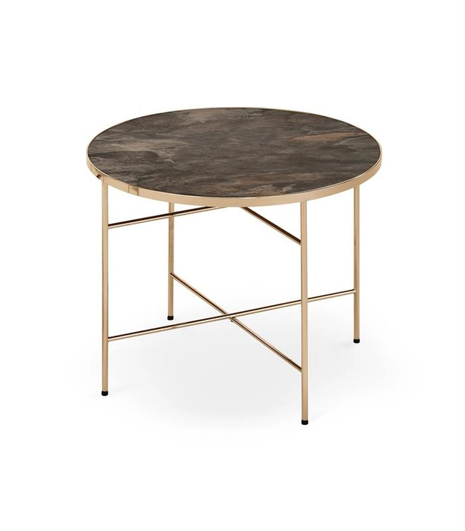 Ława ISABELLE to wyjątkowy mebel, który łączy nowoczesną elegancję z ponadczasowym stylem. Okrągły blat ze szkła w efektownym wykończeniu ciemnego marmuru przyciąga wzrok i nadaje wnętrzu ekskluzywnego charakteru. Delikatny połysk blatu pięknie komponuje się ze stelażem w kolorze champagne, tworząc harmonijną, gustowną całość.