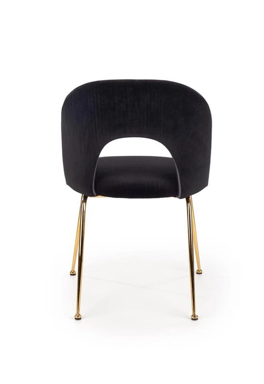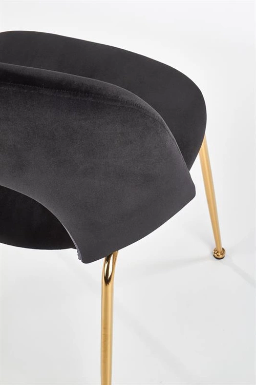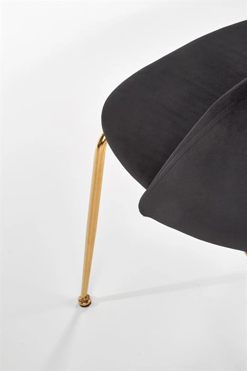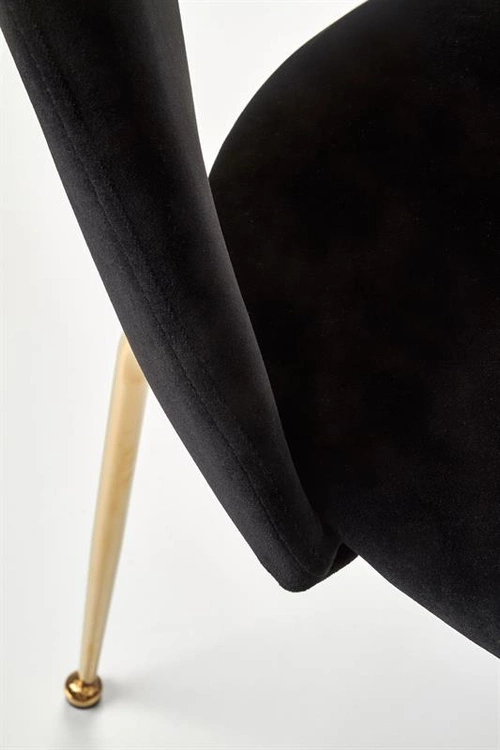 - Krzesło K385 w kolorze czarnym ze złotą podstawą to elegancki mebel o nowoczesnej formie. Miękka tapicerka z tkaniny i błyszczące złote nogi tworzą luksusowe połączenie, idealne do jadalni, salonu lub stylowego biura.
